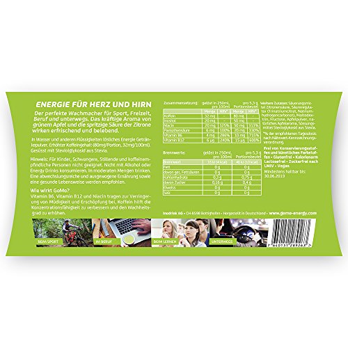 VEILIG EN 100% NATUURLIJK bron van pure energie voor lichaam en hersenen. Laag caloriegehalte, zonder suiker – gezoet met Steviolglycosiden van Stevia plant, zure en verfrissende groene appelsmaak drank. Handig en gemakkelijk te gebruiken, altijd klaar om vermoeidheid te bestrijden.