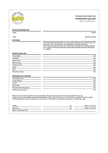 Hoogste werkzame stof: de kamille-bloemen zijn gemaakt van duurzame, ecologische teelt en worden op een veilige manier verwerkt. Kamille als thee of als bad is een beproefd huismiddel.