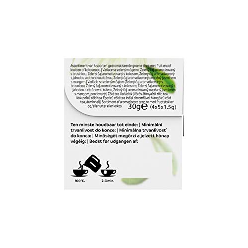 100% natuurlijke groene thee met de smaken kokos, cranberry, mango-jasmijn en aardbei-citroengras, met 4 smaken in één doosje voor ieder wat wils